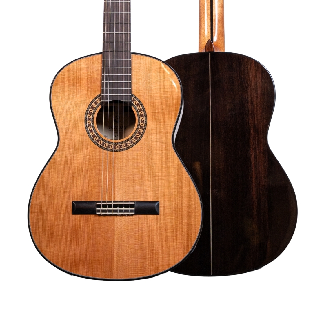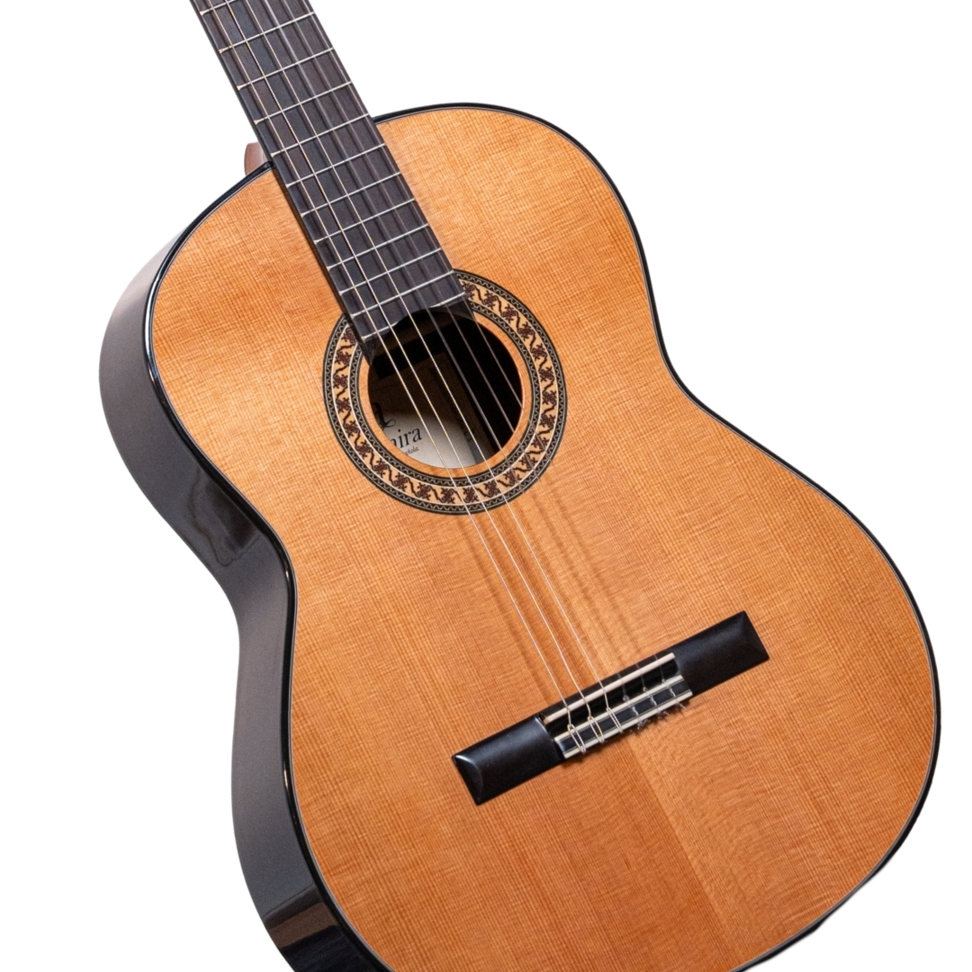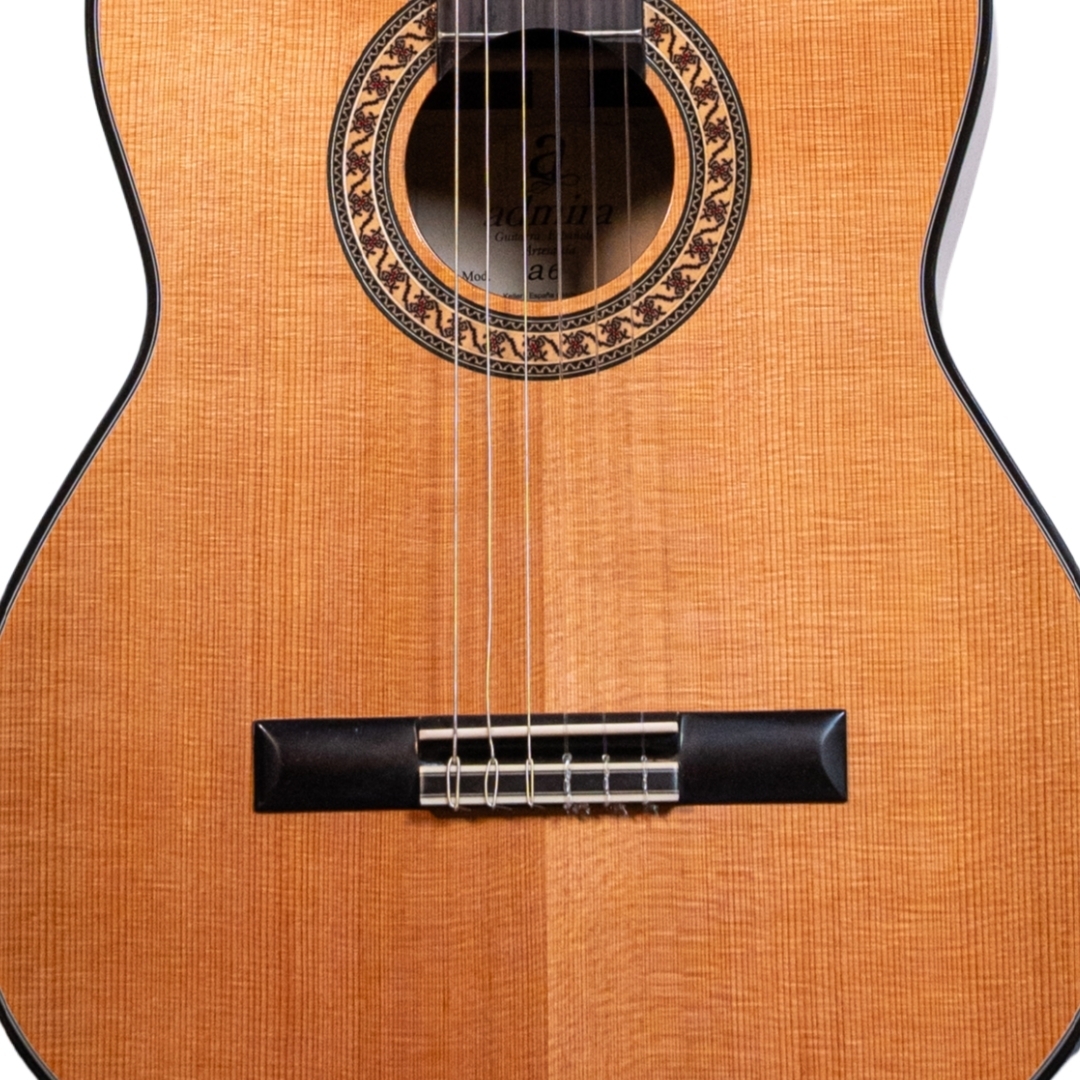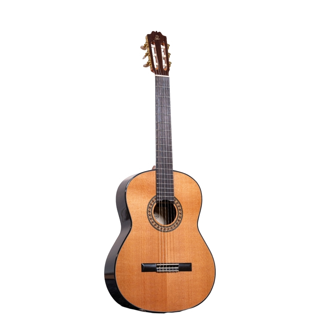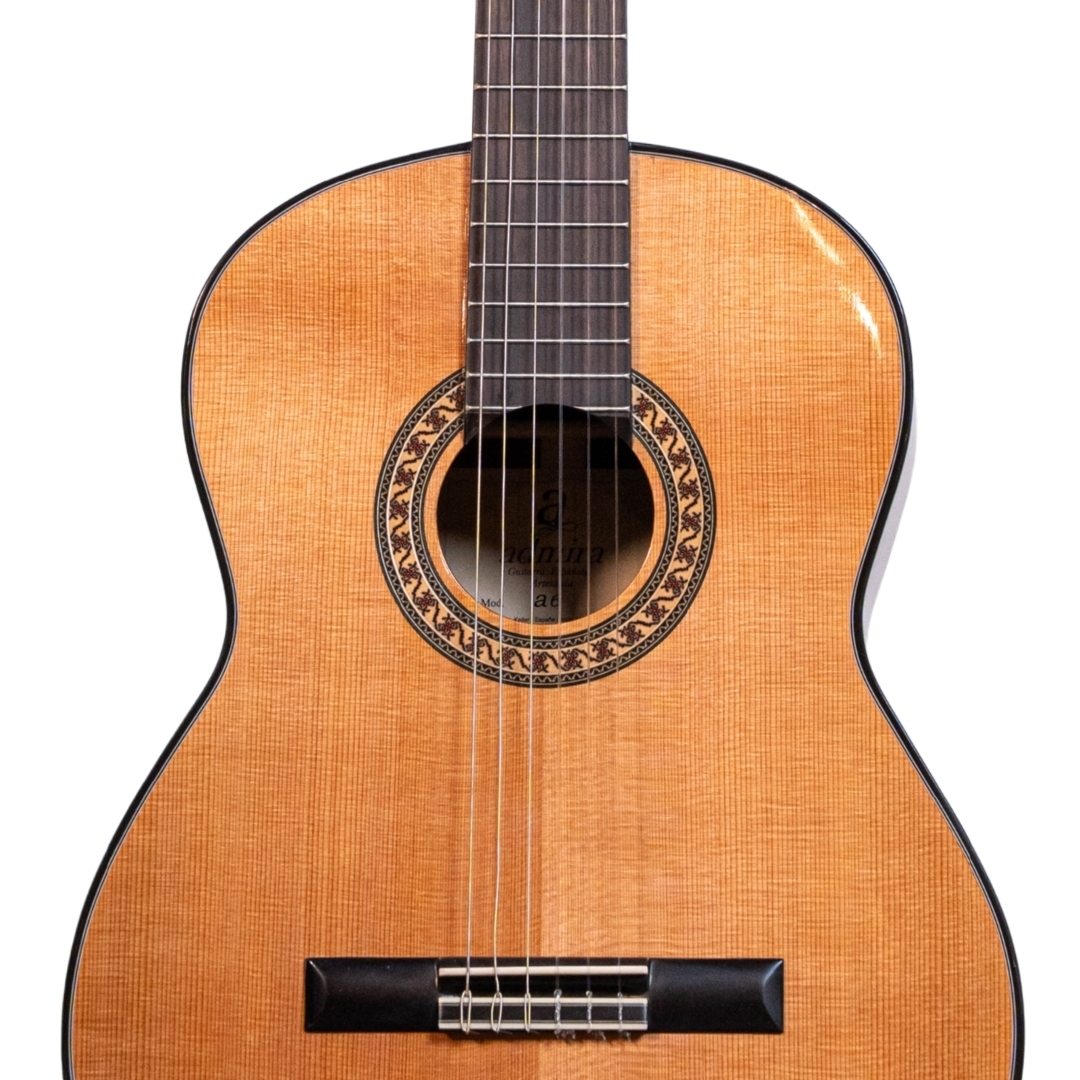 The Admira ‘A6’ Classical is crafted from the classic combination of solid Cedar and Rosewood. The A6 features a maple back inlay and Rosewood reinforced Mahogany neck. Fitted with gold machine heads and finished in high-gloss.