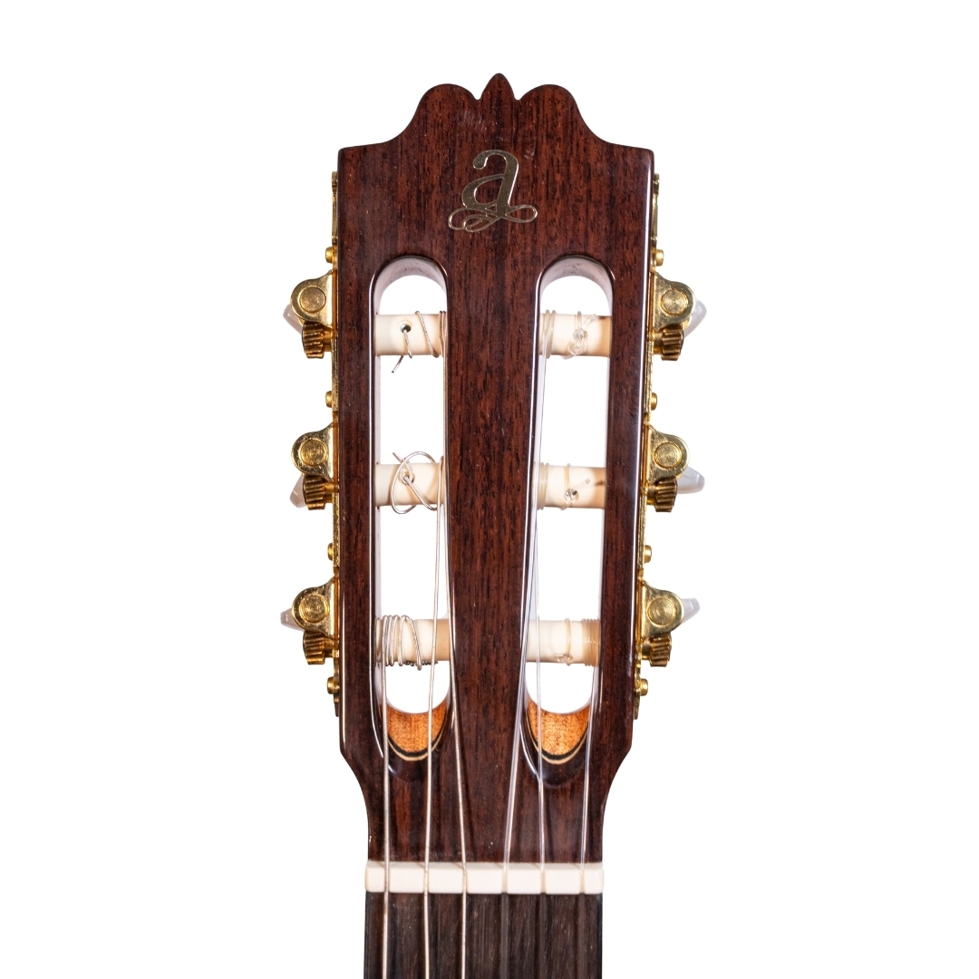 The A6 is crafted with the traditional spanish heel neck joint which is considered the most highly developed neck joint in guitar construction. It is significantly more complex than a glued neck, but the sonic benefits are worth the effort. When building a guitar with a Spanish neck, neck and headblock are carved from one piece of wood.