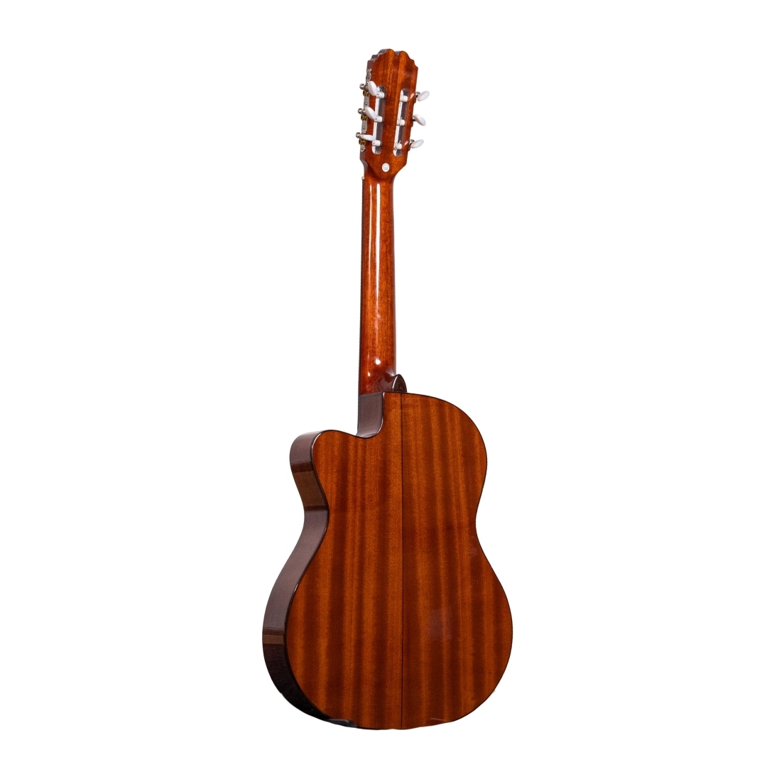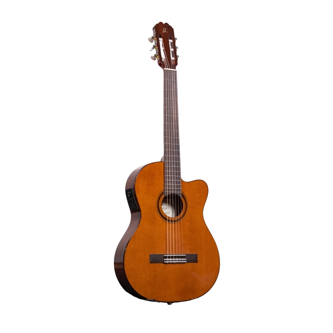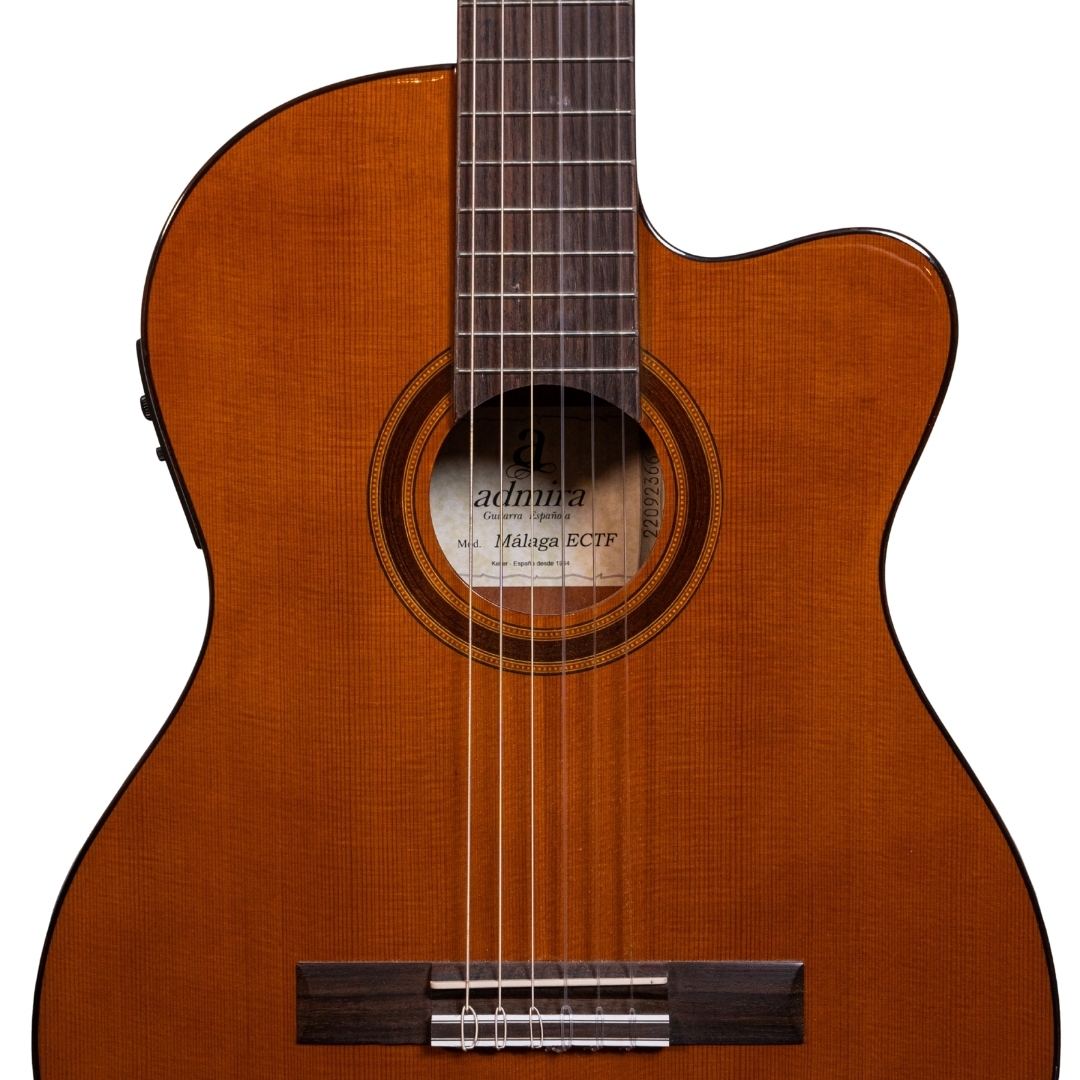 The Admira Malaga ECTF is an electro-classical guitar with cutaway and thin body. Despite its very reasonable price, the Admira Malaga ECTF is a genuine Spanish guitar which is made in Spain using superb materials, precise craftsmanship and a very lovely sound for the price. The action of the guitar has been calibrated to perfection and the sound is very well balanced. As well as the solid cedar top, the Admira Malaga has a sapelly back and sides, African Mahogany neck, and rosewood fingerboard and bridge. With nickel-plated machine heads. The electronics are the Admira EQ-6 or Fishman Classic III.