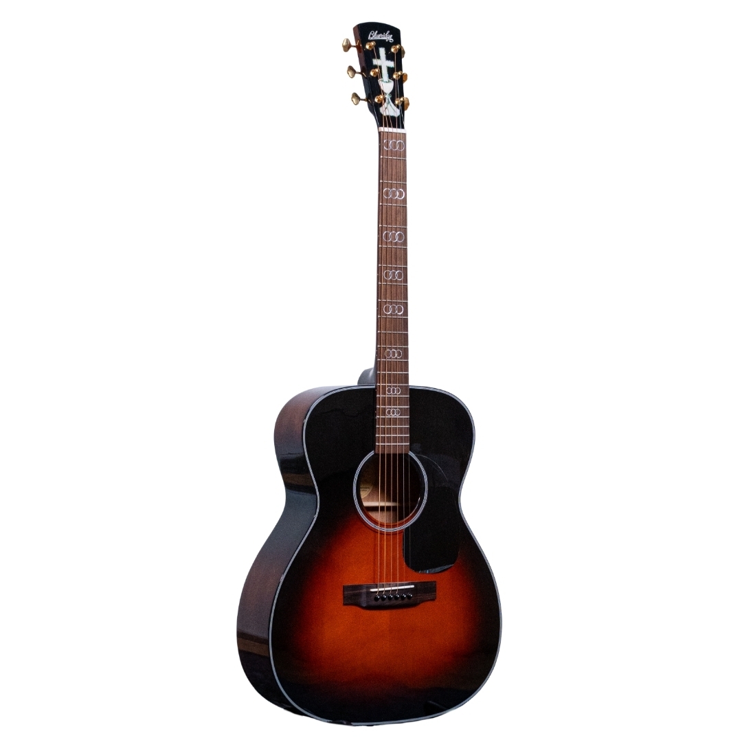 The Blueridge Gospel Model BR-343 acoustic guitar is a member of the Contemporary Series. Mahogany back and sides are topped with solid Sitka spruce, so you'll get a textured tone with plenty of power.. It features a magnificent abalone and pearl Chalice and Cross on the headstock, while the ancient locked ring symbol for the Trinity marks the fingerboard, giving it a stunningly beautiful look.