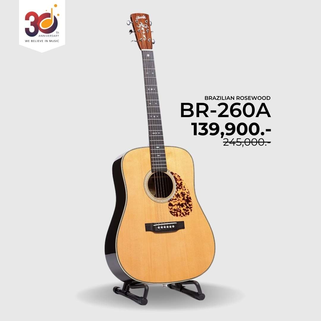 Blueridge BR-260A สาย ''Struumming'' ถูกใจสิ่งนี้ ออกแบบมาเป็นอย่างดีด้วยการวางโครงสร้าง Bracing แบบ Forward shifted-X pattern ช่วยในการสั่นขยับตัวของไม้หน้าได้ดียิ่งขึ้น รวมเข้ากับทรงบอดี้ ''Dreadnaught'' เสียงดังพลังล้นเหลือ! ชัดเจนทุกตัวโน้ต... Pickguard สไตล์ Dalmatian Tortoise สะท้อนกลิ่นอายย้อนยุคแบบดั้งเดิม เดินขอบ Binding ด้วย Ivoroid พร้อมเคลือบ Natural High Gloss เพื่อให้เห็นลายไม้อย่างชัดเจน